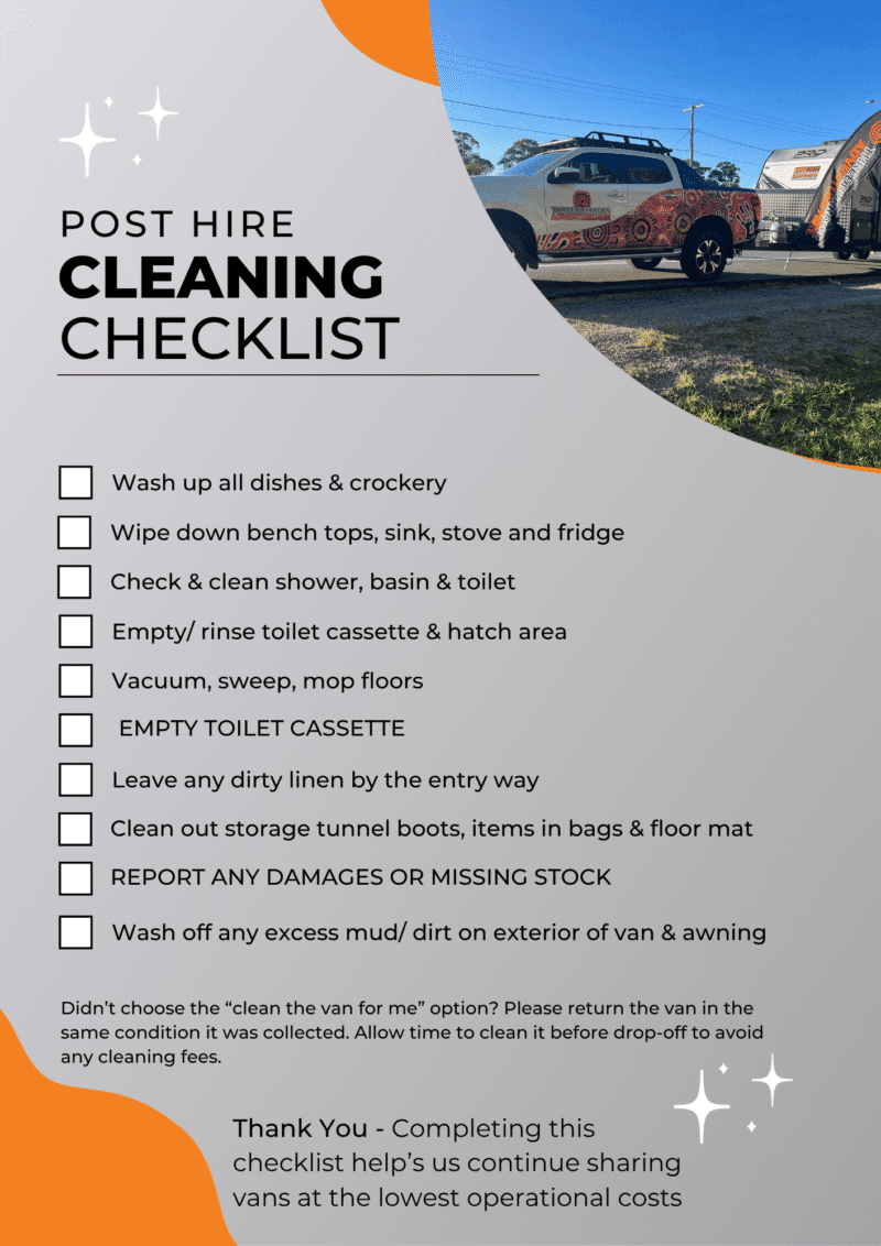 Cleaning: Please return the van in similar condition to handover—cassette emptied and rinsed, dishes washed, floors cleaned, ground sheets dirt-free, and the exterior free of sand and excess dust. Try Deception Bay Car Wash they have a dedicated Caravan wash Bay. Off-road hires require an underbody wash, Usually found nearby on main road after Beach Driving.