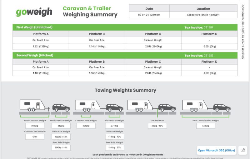 To ensure you’re within safe towing limits, visit a weighbridge after loading your caravan and tow vehicle. We recommend GoWeigh located at Caboolture Service centre North Bound. Here’s a step-by-step process for checking your weight: